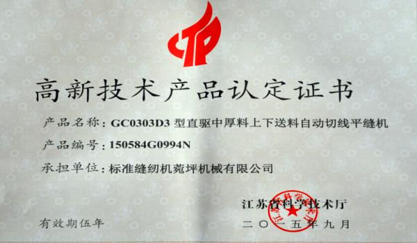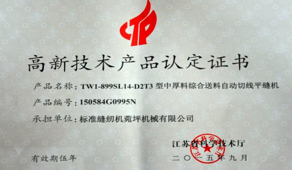近日,標(biāo)準(zhǔn)縫紉機(jī)菀坪機(jī)械有限公司兩款新產(chǎn)品獲江蘇省科學(xué)技術(shù)廳頒發(fā)的《高新技術(shù)產(chǎn)品認(rèn)定證書》。
