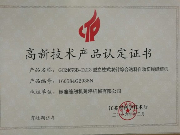 近日,標(biāo)準(zhǔn)菀坪GC24676B-D2T3立柱式雙針綜合送料自動切線縫紉機(jī)獲得由江蘇省科學(xué)技術(shù)廳頒發(fā)的《高新技術(shù)產(chǎn)品認(rèn)定證書》,這是繼GC0303D3、GC2263-D2T3、TW1-899SL14-D2T3之后,又一款新產(chǎn)品獲得省級高新技術(shù)產(chǎn)品認(rèn)定。