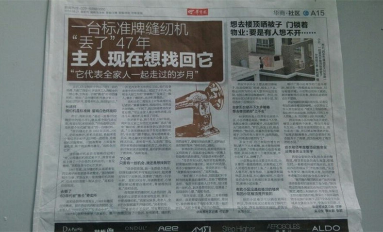 這篇報道的主人公是西安市61歲的退休工人高全和,他說,那是1962年,花了200塊錢買回來的“標準牌”縫紉機,文革中被造反派沒收,再也沒有與家人見過面。他說,那臺縫紉機代表了全家人一起走過的歲月,要是有機會,想再找到它。