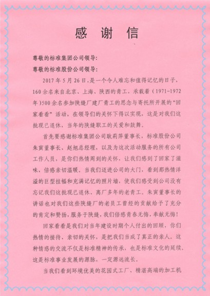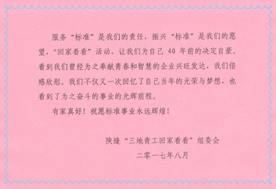 5月26日,曾經(jīng)參加過公司內(nèi)遷陜西建設(shè),為標(biāo)準(zhǔn)事業(yè)做出無私奉獻(xiàn)的160余名老青工,組織了“回家看看”活動,重新回到當(dāng)年戰(zhàn)斗的地方,追憶曾經(jīng)的流金歲月,感悟“標(biāo)準(zhǔn)”的時(shí)代變遷。