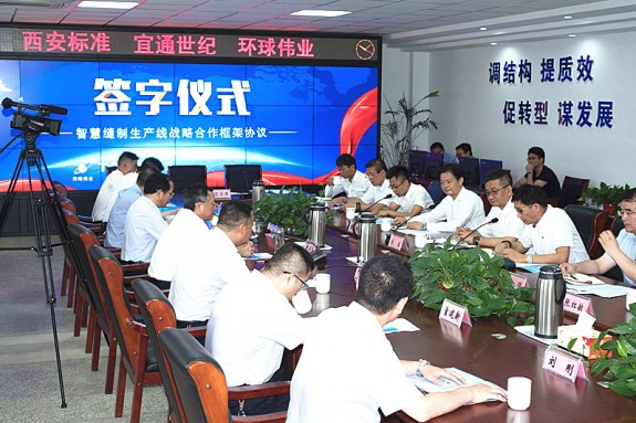 6月26日,五省通衢之地徐州,江蘇環(huán)球偉業(yè)服飾有限公司、西安標(biāo)準(zhǔn)工業(yè)股份有限公司和北京宜通華瑞科技有限公司建立長(zhǎng)期戰(zhàn)略合作伙伴關(guān)系,簽署“智慧縫制生產(chǎn)線戰(zhàn)略合作框架協(xié)議”。智慧縫制技術(shù)硬件保證、軟件支撐和實(shí)際應(yīng)用三方協(xié)議的簽訂,標(biāo)志著“智云”系統(tǒng)正式落地徐州。