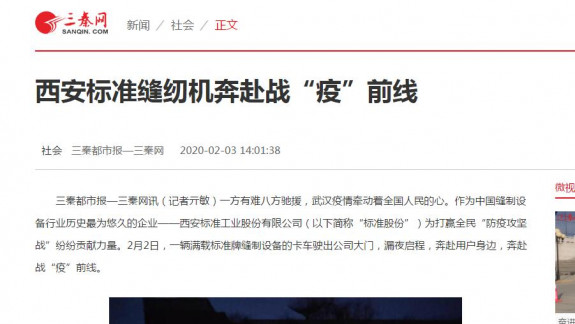 三秦都市報(bào)—三秦網(wǎng)訊(記者亓敏)一方有難八方馳援,武漢疫情牽動(dòng)著全國人民的心。作為中國縫制設(shè)備行業(yè)歷史最為悠久的企業(yè)——西安標(biāo)準(zhǔn)工業(yè)股份有限公司(以下簡稱“標(biāo)準(zhǔn)股份”)為打贏全民“防疫攻堅(jiān)戰(zhàn)”紛紛貢獻(xiàn)力量。2月2日,一輛滿載標(biāo)準(zhǔn)牌縫制設(shè)備的卡車駛出公司大門,漏夜啟程,奔赴用戶身邊,奔赴戰(zhàn)“疫”前線。