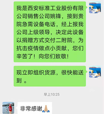 一個(gè)小時(shí)之后,我們的服務(wù)人員就把機(jī)器送到了醫(yī)院,交到后勤保障人員手中,并幫調(diào)試到最佳性能。二附院供應(yīng)科司主任對(duì)我公司急醫(yī)院所急,迅速伸出援手的舉動(dòng)表示感謝。認(rèn)為公司在大災(zāi)大難的關(guān)鍵時(shí)刻迅速行動(dòng),充分體現(xiàn)了國(guó)企的責(zé)任和擔(dān)當(dāng)。