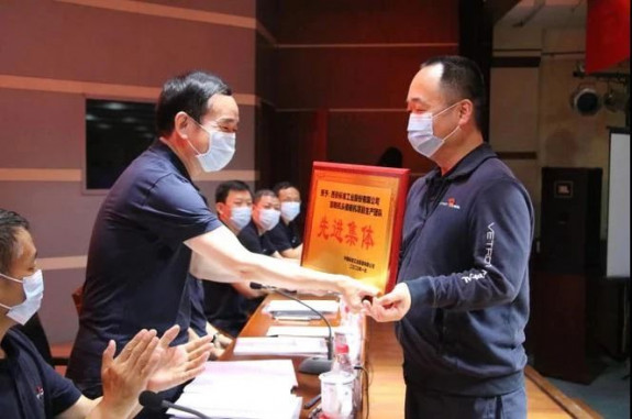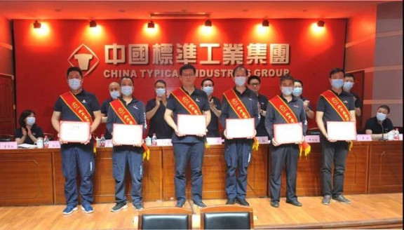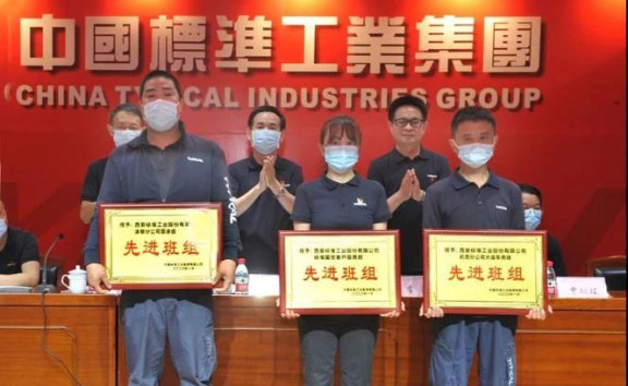 在熱烈的掌聲中,標(biāo)準(zhǔn)集團(tuán)黨委書記、董事長(zhǎng)李宏安為榮獲“先進(jìn)集體”榮譽(yù)稱號(hào)的標(biāo)準(zhǔn)股份旋轉(zhuǎn)機(jī)頭模板機(jī)項(xiàng)目生產(chǎn)團(tuán)隊(duì)頒發(fā)獎(jiǎng)牌。