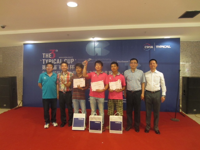 上??p紉機(jī)研究所所長(zhǎng)、大賽組委會(huì)副主任吳劍敏,中國(guó)縫制機(jī)械協(xié)會(huì)科技培訓(xùn)部副主任陳戟、公司副總經(jīng)理王培與東北賽區(qū)前三名合影